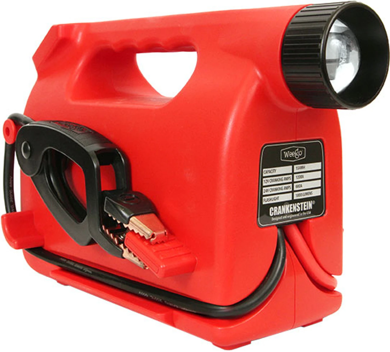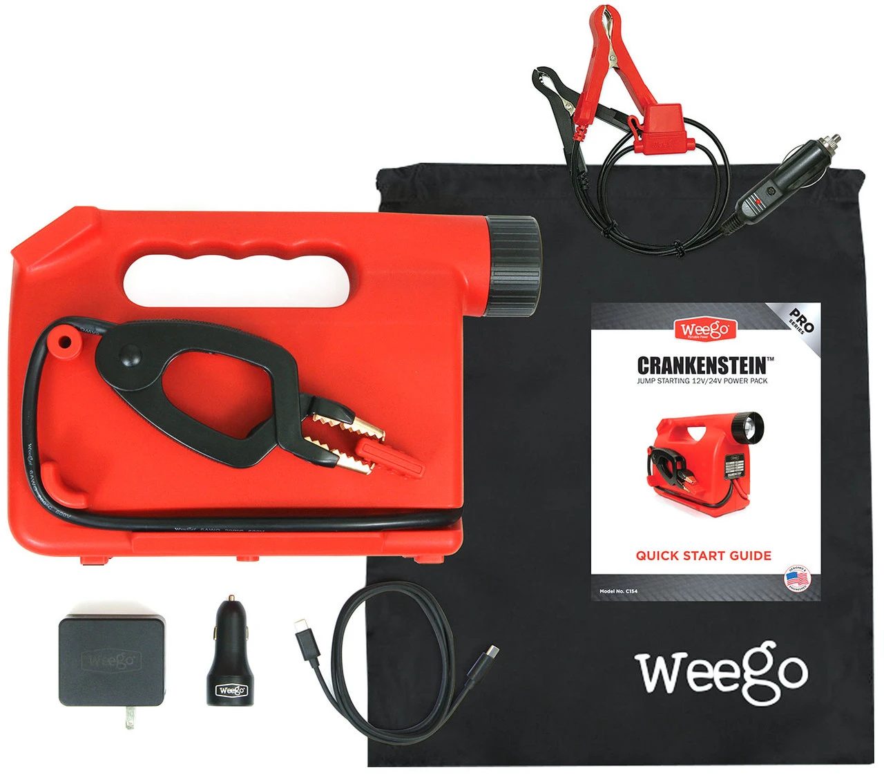 The WeeGo Crankenstein 12V/24V Jump Starter will increase your productivity by decreasing vehicle and equipment down time. The WeeGo Crankenstein is the ultimate compact, safe, reliable, and smart tool for any vessel, dock, or boat yard. This 9 lb. jump starting monster capable of jumping gas and diesel engines with 12V or 24V battery systems is a full replacement for your 40+ lb. lead-acid jump packs. The Crankenstein boasts an ultra-stable, high performance lithium-iron phosphate battery and an intuitive operation that requires zero training. Additional highlights include an OLED screen, and new smart technologies such as a digital voltmeter, sub-zero jump starting capability, patent-pending Connection Detection, and comprehensive built-in protections to walk users through a safe, dependable and successful jump every time. This multifunctional, convenient portable power source also includes an industrial-grade 1000 lumen adjustable work light, 12V CLA port, USB-C charging kit and lightning-fast USB ports.